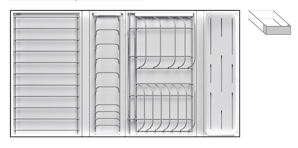 Модель — 1 большой модуль для посуды + 1 большой модуль с решеткой + 1 малый модуль для посуды + модуль для столовых приборов