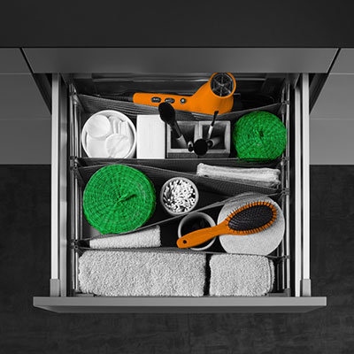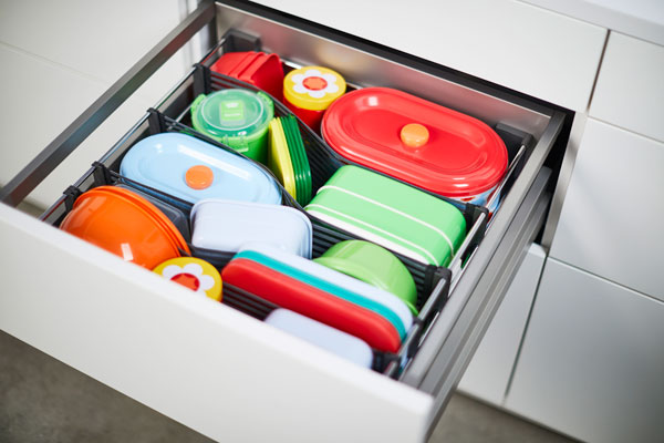 Традиционно органайзер SpaceFlexx предлагается для кухонных ящиков. Он наводит идеальный порядок на кухне – контейнеры, крышки, баночки рассортированы и удерживаются пластиковыми вставками. Содержимое ящика не опрокидывается, не скользит при выдвижении.